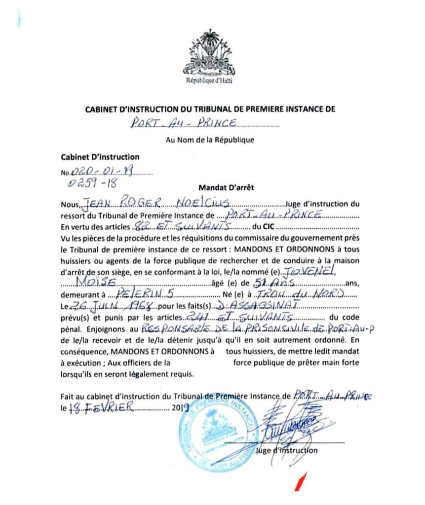 Sur demande de Mario Beauvoir avocat faisant partie du RNDDH, un autre juge d’instruction en la personne de Me. Jean Roger Noëlcius a émis un mandat d’arrêt illégal le 18 Février 2019 contre le Président Jovenel Moïse à partir d’un dossier dont il n’avait pas la charge. Voir copies du mandat du juge et la lettre de Beauvoir)