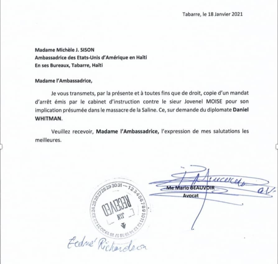 Ce même Mario Beauvoir a écrit une lettre à l’Ambassadrice Américaine Michele Sison le 18 Janvier 2021 pour lui présenter ce mandat illégal décerné par le juge Noëlcius sur la base du dossier de la Saline.