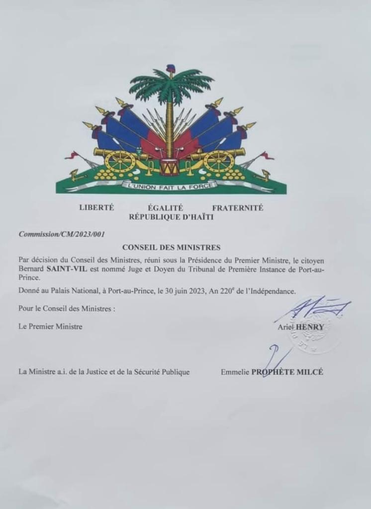 Le juge d’instruction Jean Roger Noëlcius n’était pas en charge du dossier de la Saline après les incidents survenus dans la nuit du 13 au 14 Novembre 2018. Pourtant il a utilisé ce dossier pour émettre un mandat illégal contre le Président en fonction de la République, Jovenel Moïse, en violations à la constitution et aux lois du pays. Comment le Doyen du Tribunal de Première Instance, Bernard Saint Vil a-t-il permis une telle ignominie? Le juge d’instruction en charge du dossier de la Saline, Chavannes Etienne était-il au courant de l’action illégale de Noëlcius? Eronce Villard était Commissaire du Gouvernement du TPI au premier semestre de 2019, actuellement directeur de cabinet du ministre de la Justice Emmelie Prophète. Est-ce qu’on l’a roulé dans la farine ou était-il au courant? Est-ce que le Premier Ministre Jean Henry Ceant et son Directeur de Cabinet Jimmy Albert ont joué un rôle dans l’émission de ce mandat illégal comme le suggère la clameur publique? Est-ce qu’il y avait une instruction politique qui s’est opérée avec un système judiciaire parallèle au sein même du Tribunal de Première Instance (TPI) de Port-au-Prince? Est-ce que le Conseil du Pouvoir Judiciaire (CSPJ) était au courant? Est-ce qu’il y aurait collusion entre Chavannes Etienne devenu Doyen en Avril 2023 lorsqu’il a nommé le juge politique Jean Wilner Morin sur ce dossier? Est-ce que Bernard Saint Vil nommé en Juillet 2023 a été délégué par Ariel Henry pour enterrer ces dossiers judiciaires dont la mafia judiciaire a perdu le contrôle? Quel est le rôle de Pierre Espérance et Mario Beauvoir dans la création de ce mandat illégal contre le Président Jovenel Moïse et la gestion du TPI parallèle? Pourquoi Walther Wesser Voltaire essaie d’enterrer les mandats du 9 Juillet 2021 émis contre Reginald Boulos, Dimitri Vorbe, Jerry Tardieu, Pasha Vorbe ect. impliqués dans l’assassinat du Président Jovenel Moïse? Pourquoi voudrait-il faire disparaître le réquisitoire d’informé du Commissaire Bedford Claude impliquant le Premier Ministre Ariel Henry dans l’assassinat du président?