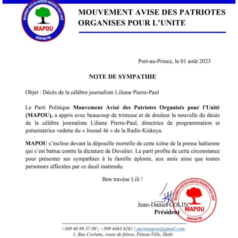 C’est avec beaucoup de tristesse et de douleur que le parti politique Mouvement Avisés des Patriotes Organisés pour l’Unité (MAPOU) a appris la nouvelle du décès de la célèbre journaliste Liliane Pierre Paul, directrice de programmation et présentatrice du journal 4è de la Radio Kiskeya.