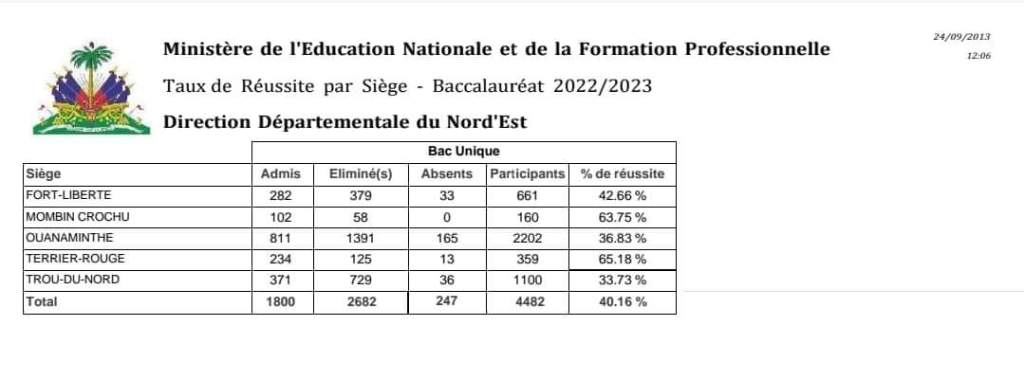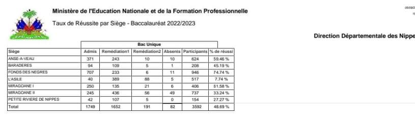 Le ministère de l’Éducation nationale et de la Formation professionnelle (MENFP) a l’avantage de publier les résultats des examens du bac unique (Secondaire 4) pour les départements des Nippes et du Nord-est.
