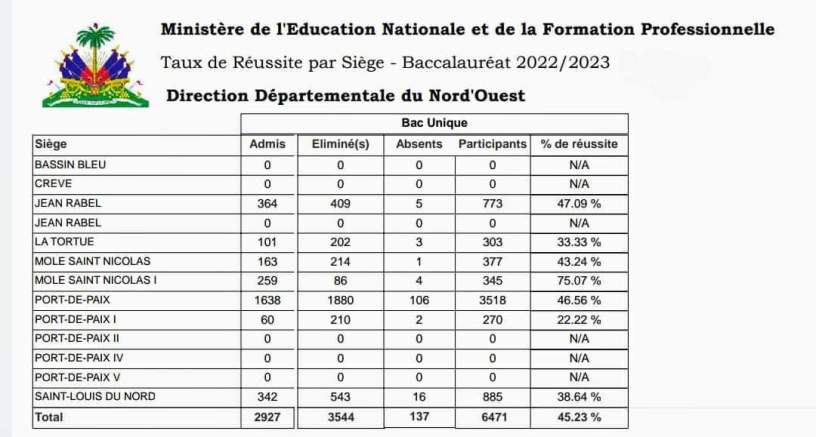Le ministère de l’Éducation nationale et de la Formation professionnelle (MENFP) a l’avantage de publier les résultats des examens du bac unique (Secondaire 4) pour le département du Nord-Ouest.