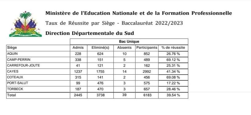 Le ministère de l’Éducation nationale et de la Formation professionnelle (MENFP) a l’avantage de publier les résultats des examens du bac unique (Secondaire 4) pour le département du Sud.
