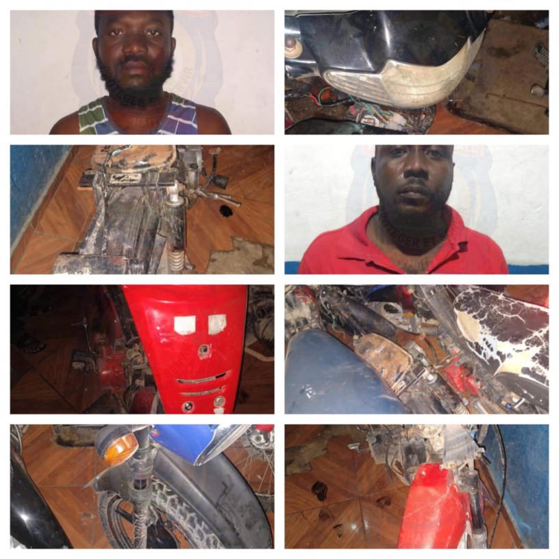 La Police Nationale d’Haïti dans le Département du Sud’Est, assistée du Juge de Paix Jeudi Marc Edouard a procédé à l’arrestation de Colon Muller Reginald et de Thomas Jameson pour association de malfaiteurs et vols de motocyclettes.