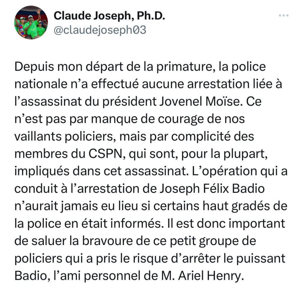 Depuis mon départ de la primature, la police nationale n’a effectué aucune arrestation liée à l’assassinat du président Jovenel Moïse.