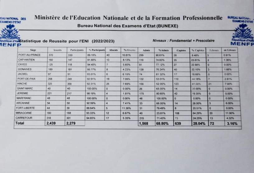 Taux de réussite au niveau national : 68.80% Le ministère de l’Education nationale et de la Formation professionnelle (MENFP) a l’avantage d’informer le public, en général, et la communauté éducative, en particulier, que les résultats des examens officiels des Écoles normales d’instituteurs (ENI), pour les niveaux fondamental et préscolaire, de l’année académique 2022-2023 sont désormais disponibles.