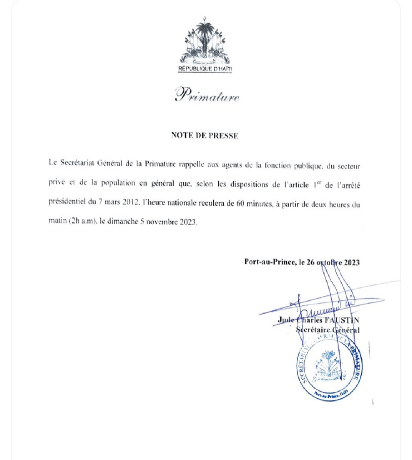 Le secrétaire général de la primature informe aux agents de la fonction publique du secteur privé et de la population en générale, que selon les dispositions de l’article 1er de l’arrêté présidentiel du 7 mars 2012 que l’heure sera reculée de 60 minutes.