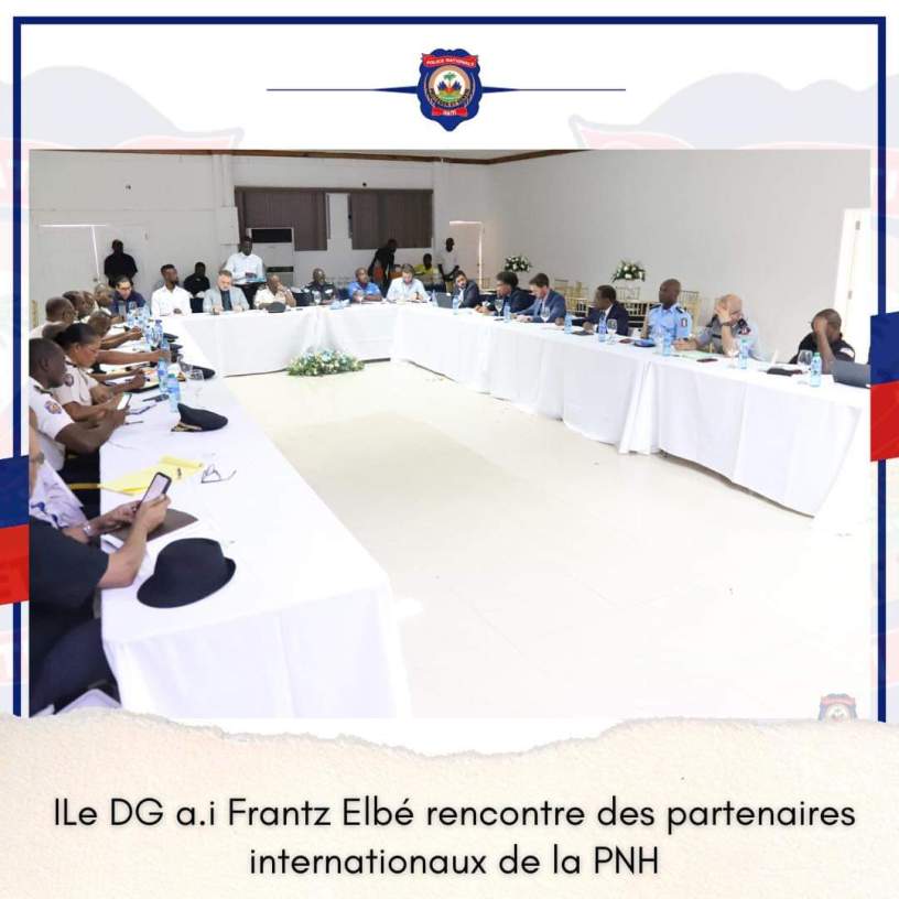 Le Directeur Général a.i de la Police Nationale d’Haïti (PNH), M. Frantz Elbé, accompagné des membres du Haut Commandement de la PNH, a rencontré, des partenaires internationaux de l’institution policière, le lundi 4 décembre 2023, à la DGPNH, sise à Clercine, commune de Tabarre.