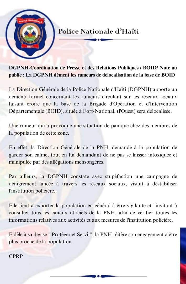 La direction Générale de la Police Nationale d’Haiti (DGPNH) dément formellement les rumeurs circulant sur les réseaux sociaux faisant croire que la base de BOID qui se trouve à Fort -National sera délocalisé.