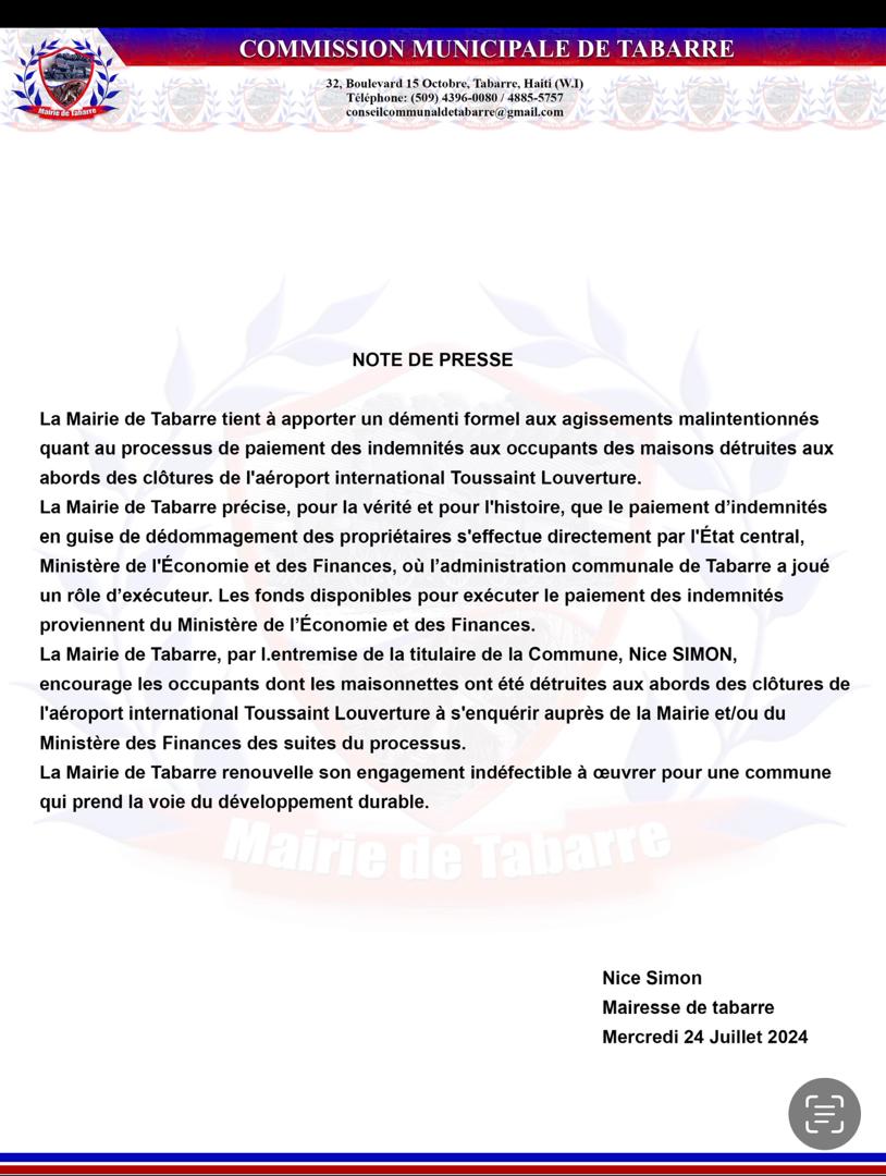 La Mairie de Tabarre à travers la titulaire de la Commune, Nice SIMON encourage les propriétaires dont les maisonnettes ont été détruites au niveau de l’aéroport à s’enquérir auprès de la Mairie et/ou au niveau du Ministère des Finances des suites du processus. La mairie de Tabarre renouvelle son engagement indéfectible à œuvrer pour une commune qui connaît la voie du développement.
