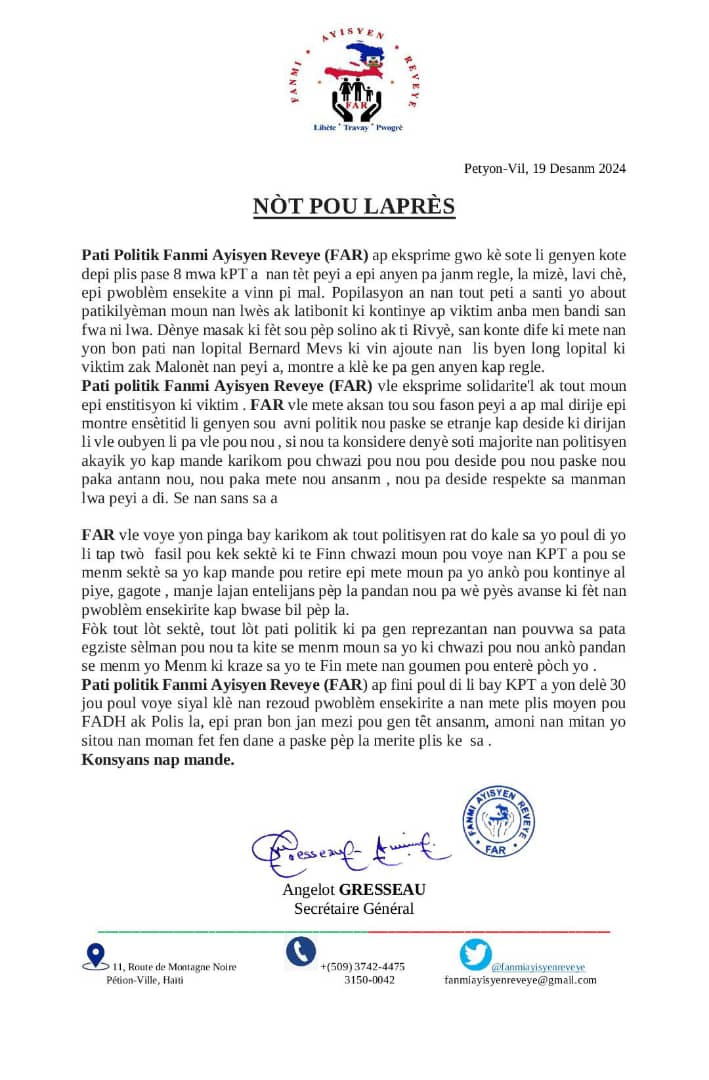 Le parti politique Fanmi Ayisyen Reveye (FAR) s’est exprimé sur le dernier dénouement de la crise politique dans le pays. En effet, la structure politique FAR dit se solidariser aux nombreuses victimes des violences des derniers jours. « FAR entend mettre l’accent sur la mauvaise gouvernance et exprimer nos incertitudes quant à l’avenir chaotique de la politique appliquée dans ce pays avec les étrangers qui décident comme bon leur semble de notre avenir « , lit-on dans le communiqué du parti politique FAR.
