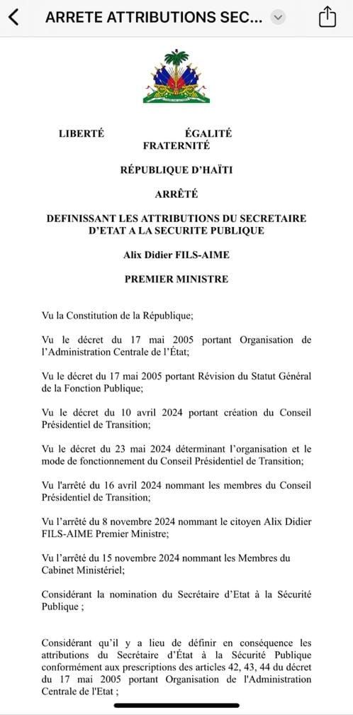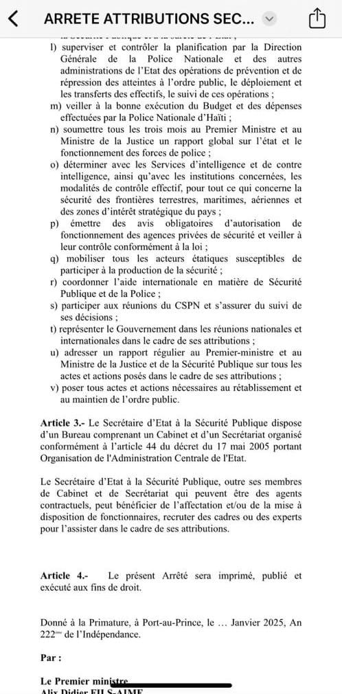 Lè ou gade byen, arete premye minis Fils-Aime pran pou nonmen Mario Andresol sekretè deta sekirite piblik, ou dekouvri misye se yon kreten e yon enkonpetan. Pou jan arete sa a ekri, nan chache bay Andresol yon pakèt pouvwa ki pa legal, li vyole lwa ki te kreye lapolis la. Li fè minis jistis la ak CSPN la tounen popetwèl. Arete sa a se yon katastròf jiridik