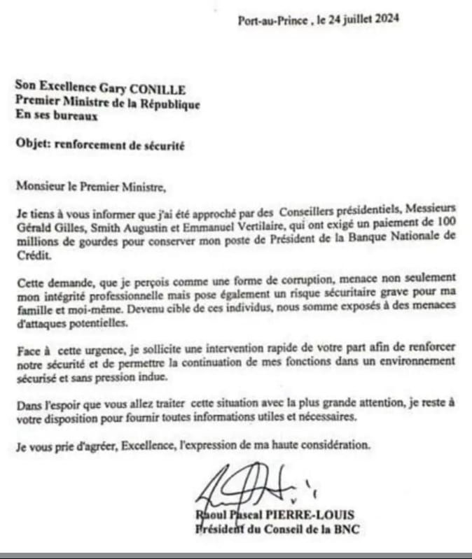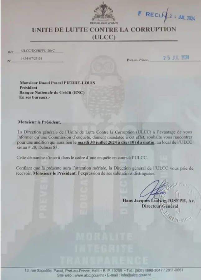 Dans le cadre du suivi, quelque chose s’est mal passé malgré la délivrance des cartes de crédits, les nominations, promotions et autres. Une fuite, une dénonciation anonyme, un remords de dernière minute? Le fait est que Raoul Pierre-Louis écrira une lettre au premier ministre en date du 24 Juillet 2024 pour dénoncer les trois membres du CPT. Suite au scandale devenu public les trois membres du CPT seront auditionnés le 27 Août 2024 par une commission de l’Unité de Lutte contre la Corruption (ULCC) conformément aux articles 11, 12 et 22 du décret du 8 Septembre 2024.