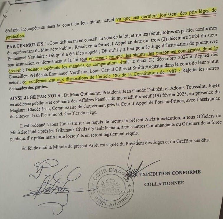 Le Commissaire du Gouvernement Lionel Bourgoin transfèrera son réquisitoire d’informé au Cabinet d’instruction. Sous pression, le Doyen du Tribunal de Première Instance de Port-au-Prince, Bernard Saint-Vil désigna le Juge d’instruction Benjamin Felisme qui convoquera Gérald Gilles le 9 Décembre 2024. Il ne s’y rendra pas. Les trois larrons vont s’abriter derrière des soit-disant prérogatives constitutionnelles liées à leur statut de Conseillers Présidentiels. Ce qui est une pure invention. Leur statut n’existe pas au niveau de la loi mère. Le CPT a été créé par un décret pris en Conseil des Ministres. Aucun citoyen(ne) de la République ne peut accéder de cette manière à la présidence ou au pouvoir exécutif d’Haïti. C’est inconstitutionnel et illégal.