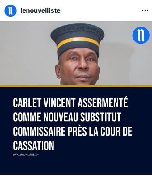 Me Carlet Vincent est promu aussi Substitut du Commissaire du Gouvernement près la Cour de Cassation de la République.https://lenouvelliste.com/article/253523/carlet-vincent-assermente-comme-nouveau-substitut-commissaire-pres-la-cour-de-cassation
