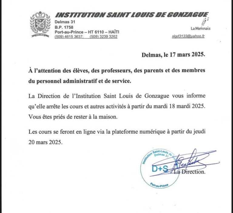 En raison du phénomène de l’insécurité qui ne cesse de croître de jour en jour dans la capitale,l’ institution saint Louis Gonzague,située à Delmas 31 et  33 dans une note publiée le 17 mars 2025 ,annonce aux élèves ,aux professeurs,parents et les membres du personnel administratif la fermeture de l’école dès ce mardi 18 mars 2025 pour un temps indéfini et demande à tous de rester chez eux.