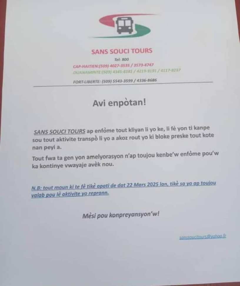 Konpayi Sansousi presize tou ke tout tikè kliyan te achte depi 22 mas 2025 ap toujou valab lè sèvis yo reprann.