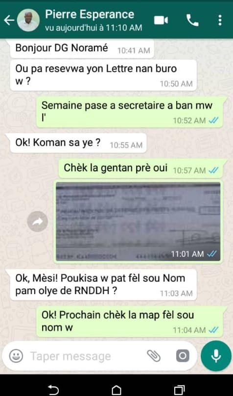 Il recevait 1.5 millions de gourdes de Privert via le BMPAD et deux autres institutions étatiques. Il avait insisté pour que les chèques émis soient fait à son nom au lieu du RNDDH, voir video e message WhatsApp ⬇️: