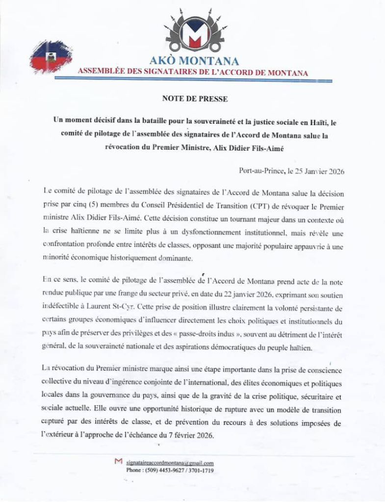 L’Assemblée de l’Accord de Montana voit dans cette décision une réponse politique forte face aux tentatives répétées de certains groupes économiques d’influencer directement les choix institutionnels du pays. À ce titre, elle fait référence à une note publiée le 22 janvier 2026 par une frange du secteur privé exprimant son soutien à Laurent St-Cyr. Pour le comité de pilotage, cette prise de position illustre la persistance de pratiques visant à préserver des privilèges et des « passe-droits indus », souvent au détriment de l’intérêt général et des aspirations démocratiques du peuple haïtien.