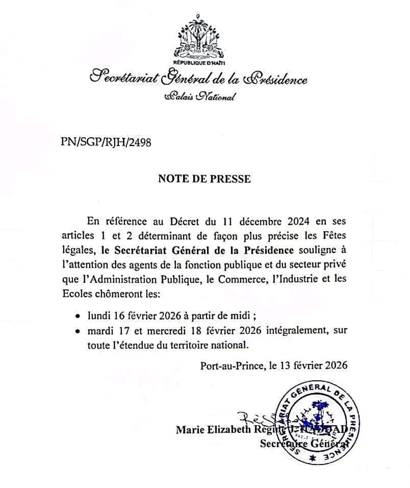 Selon la note officielle, l’Administration publique, le Commerce, l’Industrie et les Écoles chômeront le lundi 16 février 2026 à partir de midi, ainsi que les mardi 17 et mercredi 18 février 2026 dans leur intégralité. Cette décision s’inscrit dans le cadre de l’application stricte des articles 1 et 2 du décret susmentionné, rappelant l’obligation de respect des fêtes légales établies par l’État haïtien.