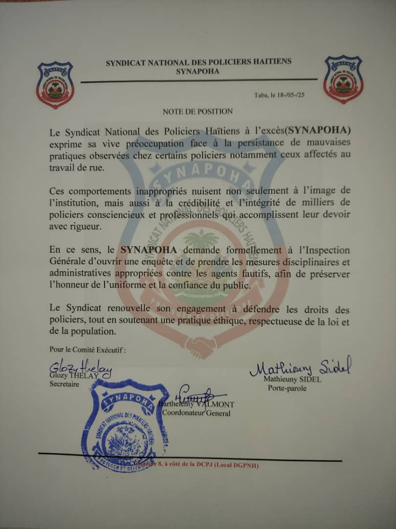 Plus de deux ans après l’alerte lancée par le SYNAPOHA, la question demeure : des mesures strictes et durables seront-elles enfin adoptées pour mettre fin à ces pratiques et renforcer la crédibilité de la PNH aux yeux de la nation ?