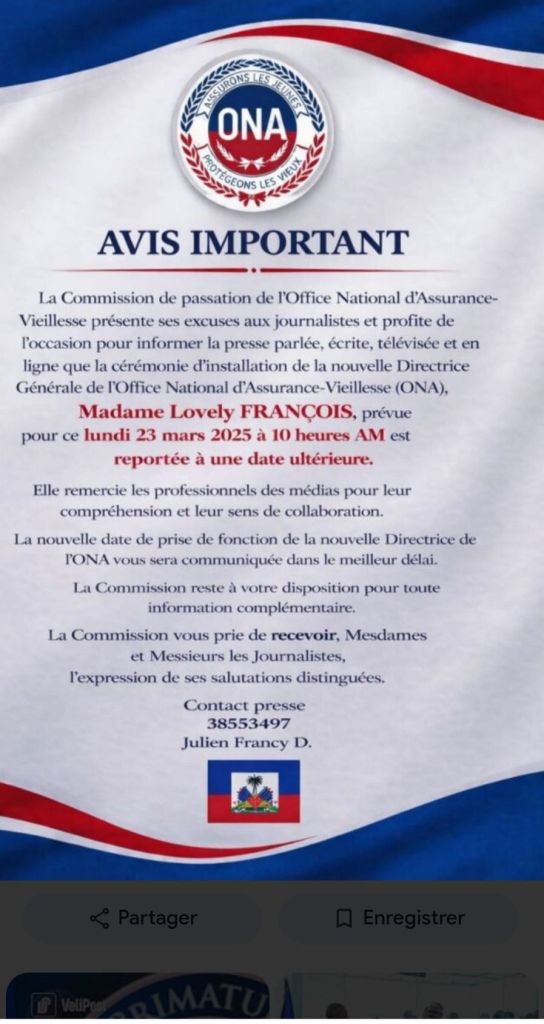 L’Office National d’Assurance-Vieillesse (ONA) traverse une zone de turbulences sans précédent. Ce lundi 23 mars, ce qui devait être une simple formalité administrative s’est transformé en un véritable camouflet pour le pouvoir central : la cérémonie d’installation de la nouvelle directrice générale, Lovely François, a été suspendue sine die sous la pression d’une base en ébullition.
