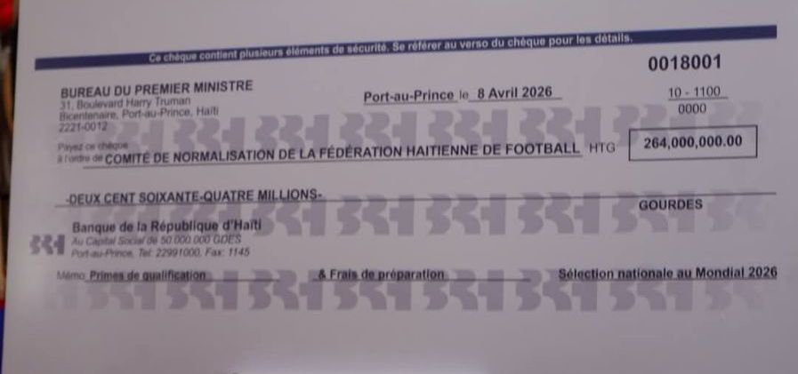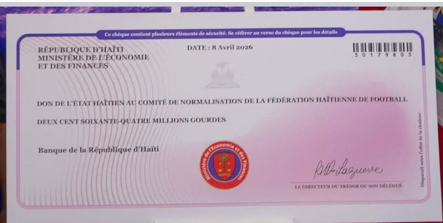 Port-au-Prince, 8 avril 2026 – À l’approche d’un rendez-vous historique, le gouvernement haïtien passe de la parole aux actes. Lors d’une cérémonie solennelle à la Villa d’Accueil, le Premier ministre Alix Didier Fils-Aimé a officiellement remis deux chèques de 264 millions de gourdes chacun au Comité de normalisation de la Fédération Haïtienne de Football (FHF).