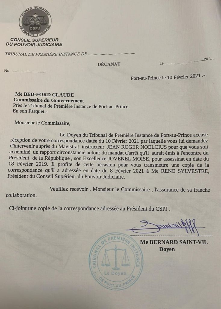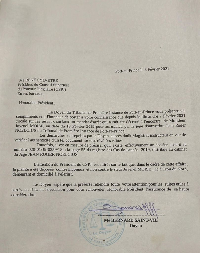 Pou touyĂ© Prezidan Jovenel MoĂŻse oligak ak politisyen kriminĂšl pral fabrike yon manda ilegal. Pou fabrike manda ilegal sa Pierre EspĂ©rance pral manipile dosyĂ© la saline nan ak konplisite jij koupyon Jean Wilner Morin. AprĂ©sa Pierre EspĂ©rance pral monte yon tribinal premyĂš enstans paralĂšl ak Jean Roger NoĂ«lcius jij de lekip ke li pĂ©yĂ© 30 mil dola vĂšt ke RĂ©ginald Boulos te bali pou achtĂ© manda ilegal sa. Men kopi manda ilegal la âŹïž: