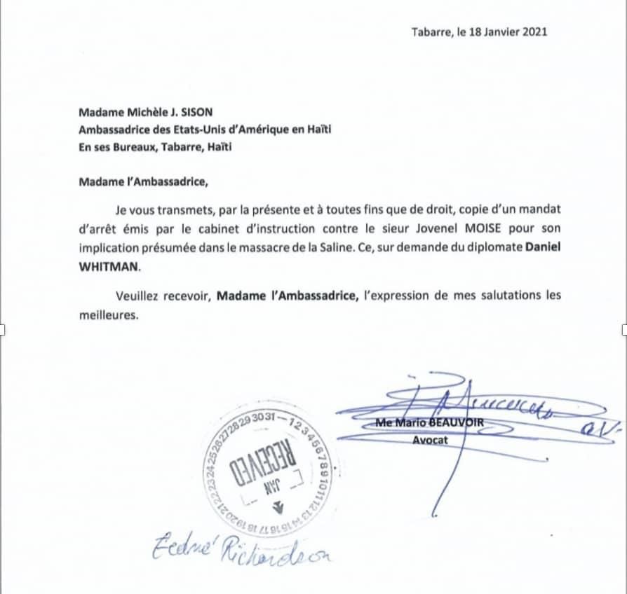 LĂš EspĂ©rance finn achtĂ© manda ilegal la nan men jij Jean Roger NoĂ«lcius li voyĂ© Mario Beauvoir ki se avoka RNDDH e avoka Aristide al depoze manda ak yon lĂšt kouvĂšti nan anbasad meriken. Men kopi lĂšt la âŹïž: