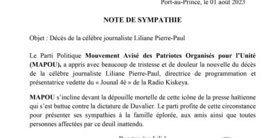 PNH: Note de sympathie à la famille de la journaliste Liliane Pierre Paul